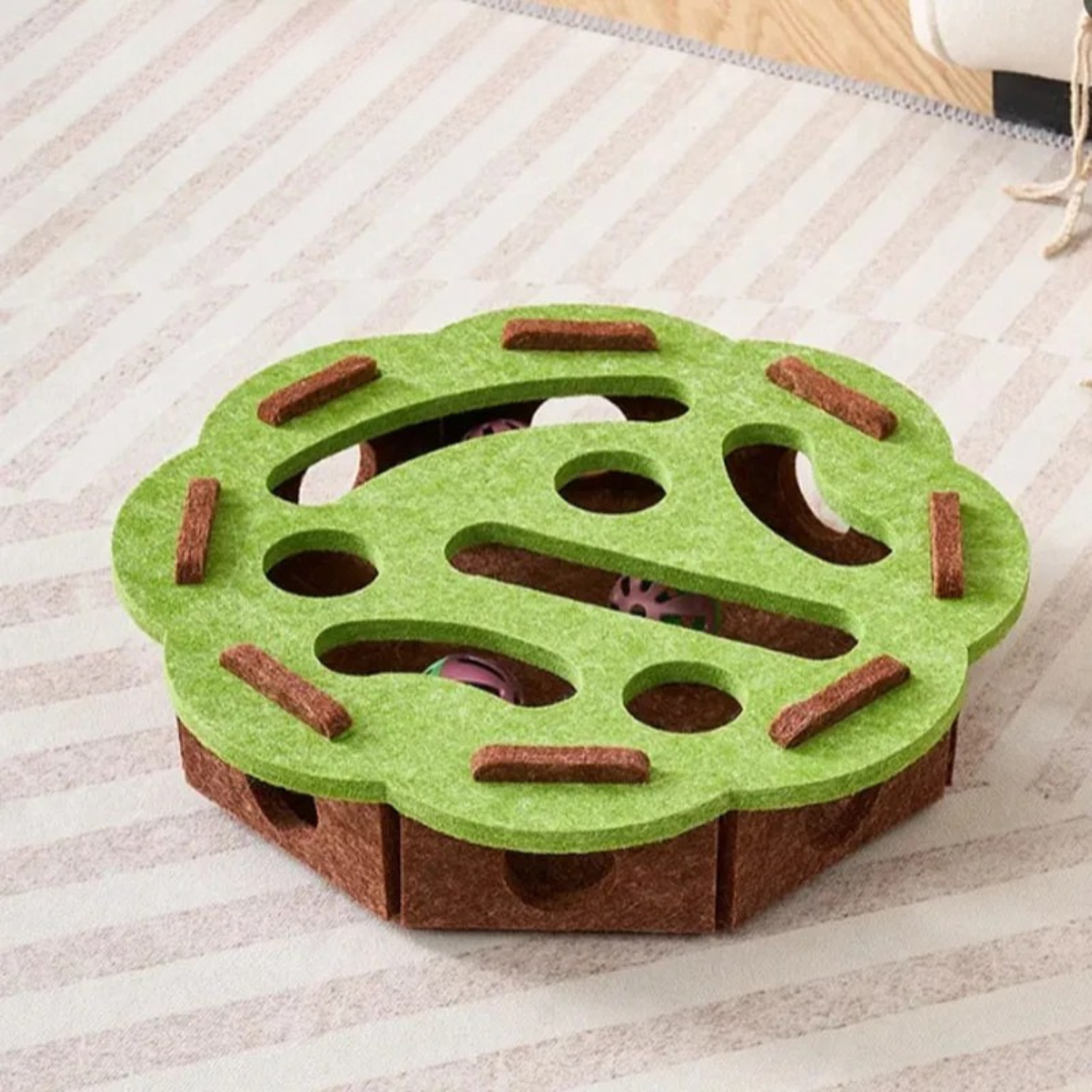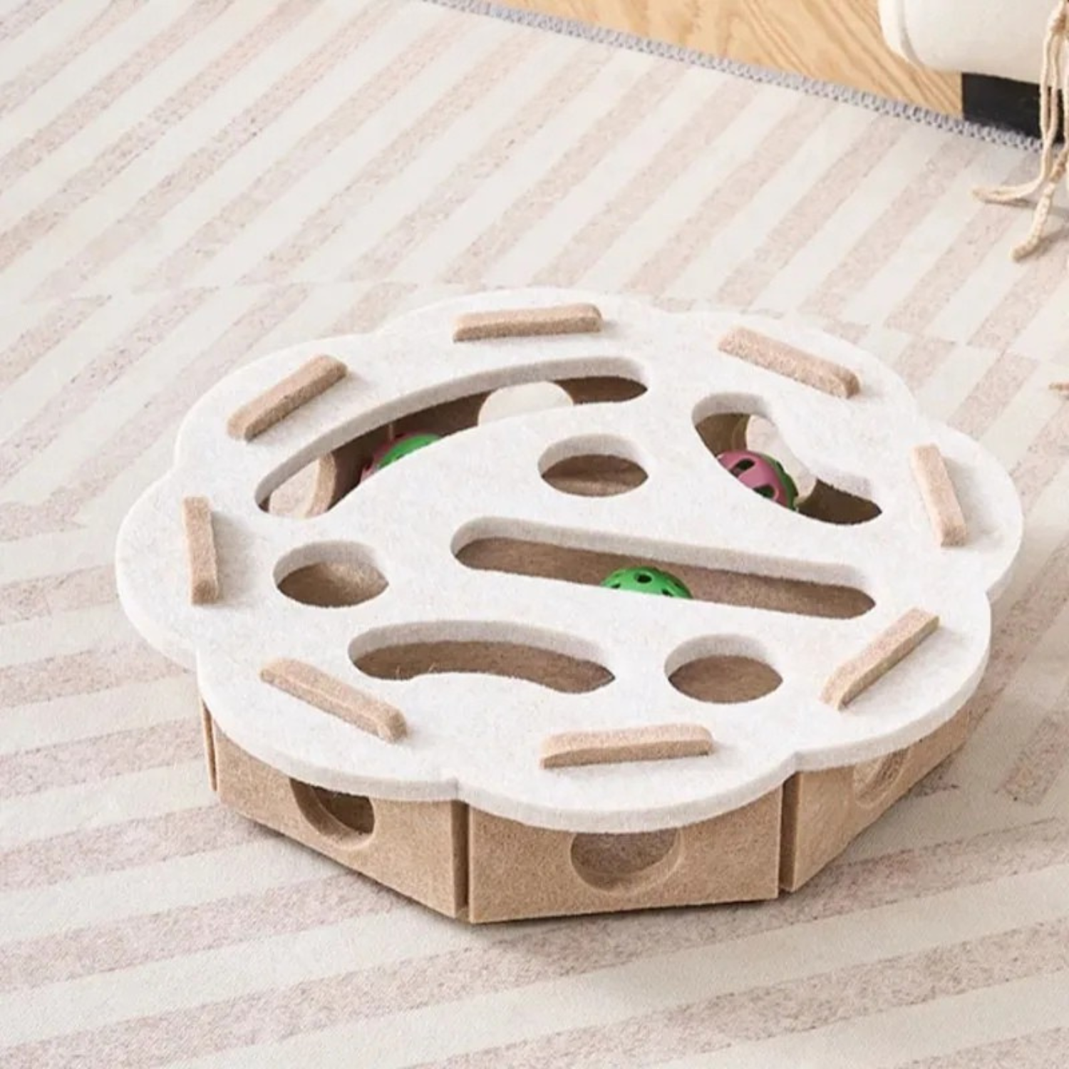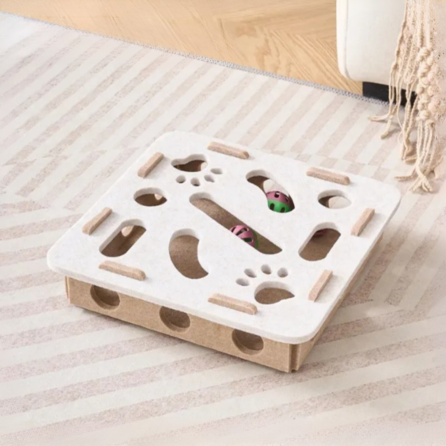 O design multifuncional permite que ele seja usado de várias formas: como arranhador, casinha de teatro ou lançador de bolas. Duas bolinhas dentro tornam cada brincadeira ainda mais envolvente, mantendo seu gatinho entretido por horas. Compacto e leve, ele pode ser colocado em qualquer canto da casa e armazenado facilmente quando não estiver em uso.