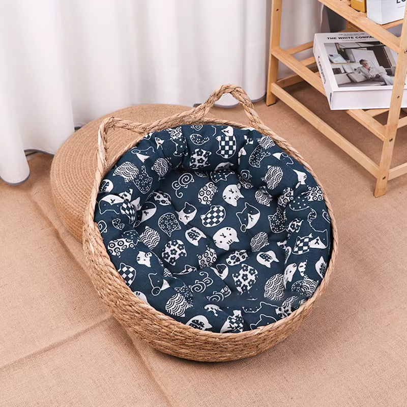 Cesta trançada artesanalmente, almofada de algodão macio e resistente, acabamento impecável e design funcional. Essa caminha une durabilidade, conforto e estética, tornando-se o cantinho favorito do seu gato — e também um toque de charme na sua casa.
