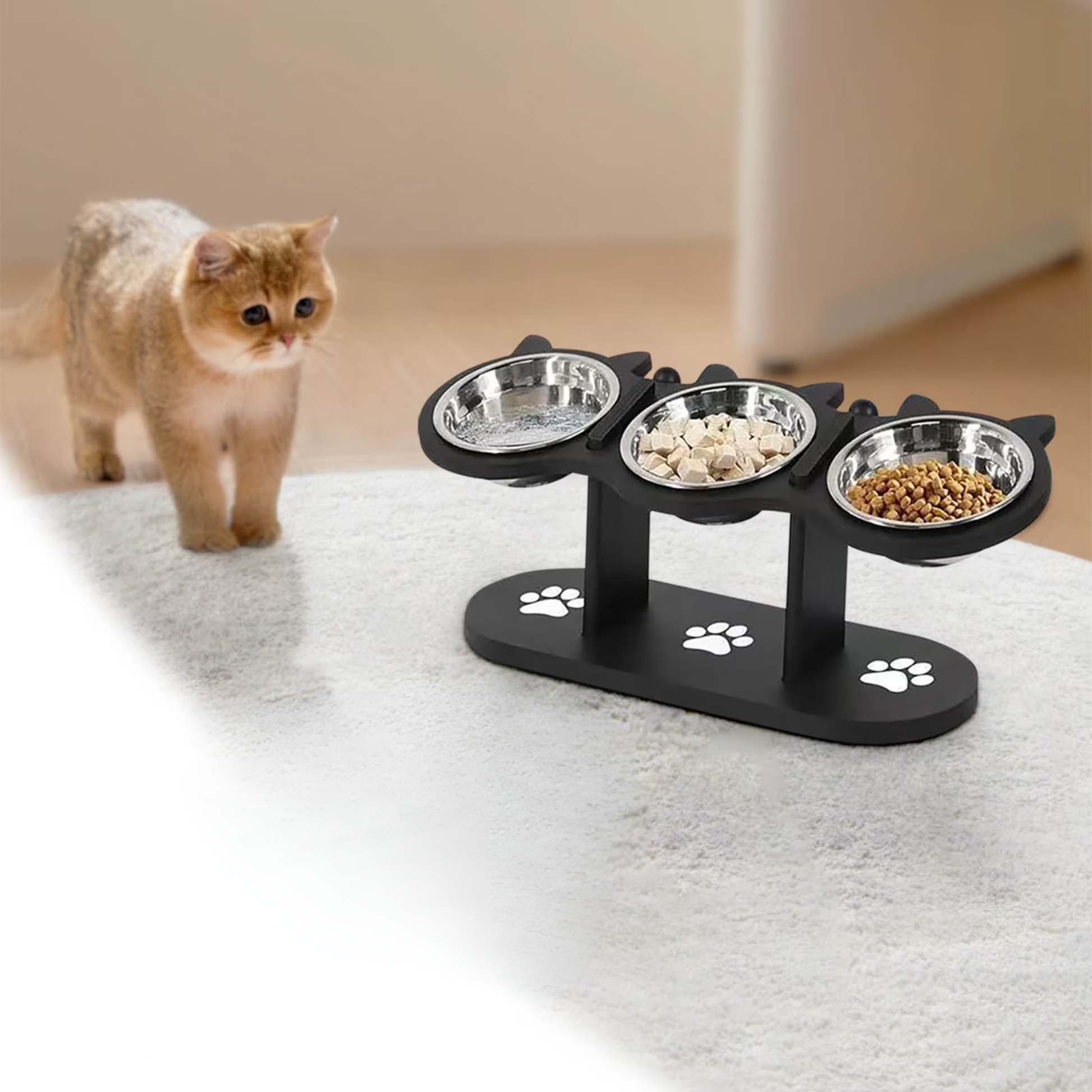 Os potes são feitos de aço inoxidável de qualidade alimentar ou seja garantem higiene e segurança — A base é estável, evita bagunça, e os três potes permitem separar água, ração e petiscos com facilidade.